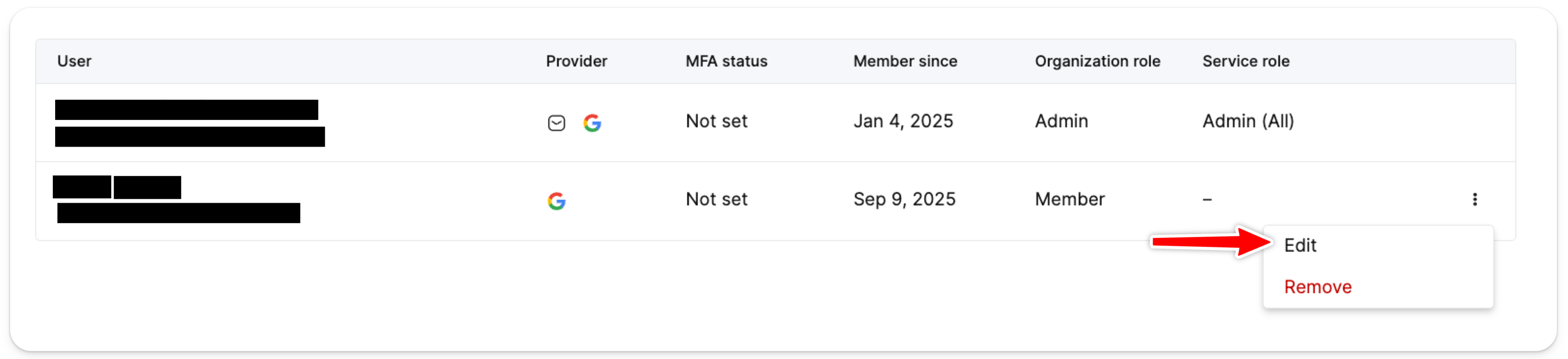 Select the drop-down menu items to adjust the access scope of the service role of the selected user. When selecting Specific services, you can control the role of the user per service.