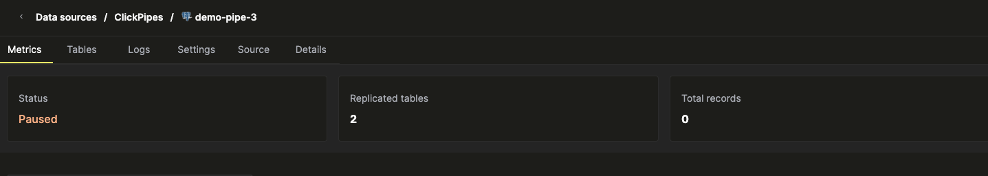1. На вкладке Источники данных нажмите на MySQL ClickPipe, который вы хотите возобновить. Статус зеркала изначально должен быть Приостановлен.