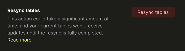 - Вам может потребоваться выполнить серьезные изменения схемы в исходных таблицах, которые сломают существующий ClickPipe, и вам потребуется перезапустить. Вы можете просто нажать Resync после внесения изменений.